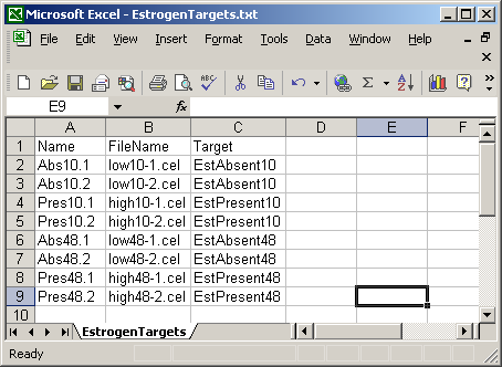 The RNA Targets file, also know as the Hybridizations file, lists the microarray hybridizations and includes for each chip, the name of the CEL file (Cell Intensity File) for that chip, which contains probe-level Perfect Match (PM) and MisMatch (MM) intensities. The Targets file should be in tab-delimited text format, A Targets file has three essential columns : Name, FileName and Target. The Name column should contain a unique name or number for each chip. The FileName column should contain the names of the CEL files. The Target column should contain a name of the type of RNA being hybridized to that chip, which is used to identify replicate chips. For example, in the Estrogen example, the first two chips have different names: "Abs10.1" and "Abs10.2", but they have the same RNA target, "EstAbsent10". Extra columns can be added if desired, but currently, only the Name, FileName and Target columns are used.